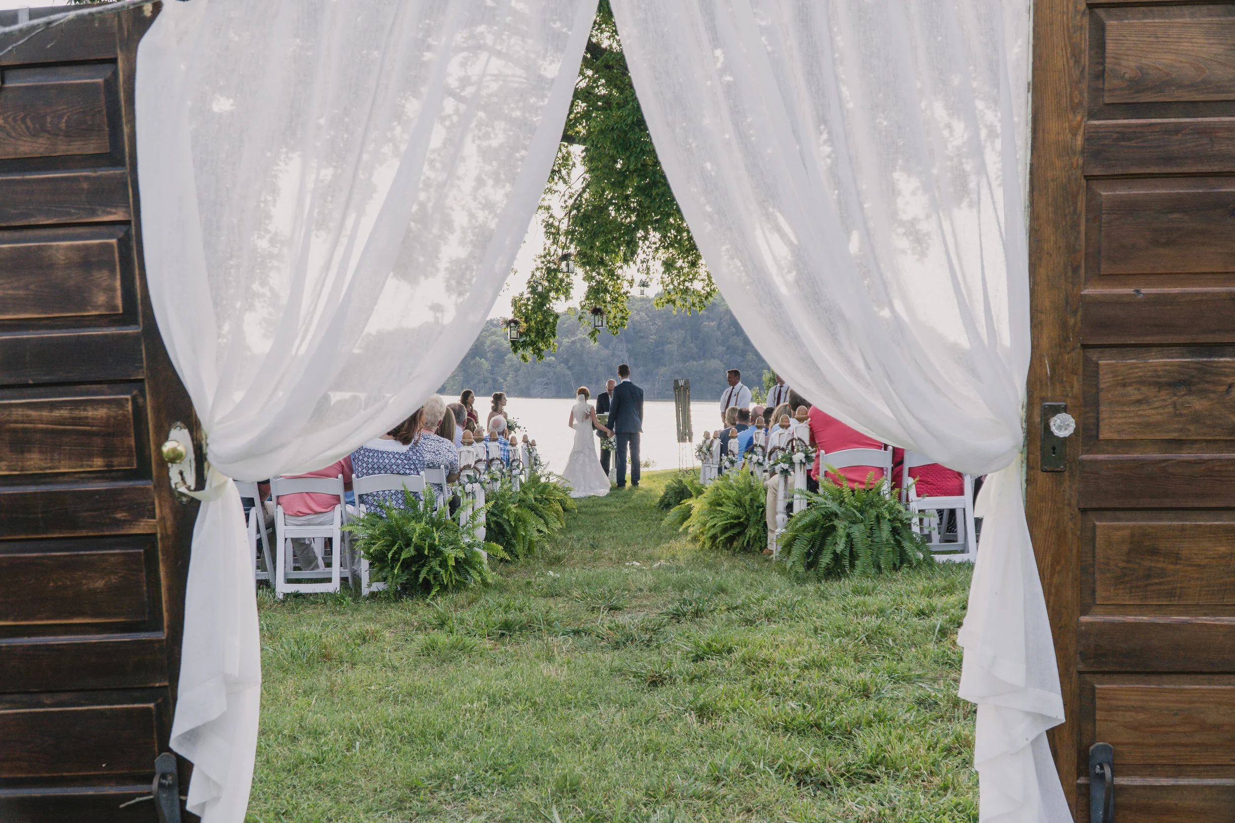 The venue was Dustin's family home on the lake and the ceremonies took place on the grounds under a massive tree and a beautiful tent. They did an outstanding job transforming a grassy shore into a classic and chic venue! The take home gift for guests were potted flowers- I mean, how cool is that? And at the end of the evening, the family surprised Kinley & Dustin with a fireworks show above the reception. It was truly magical.